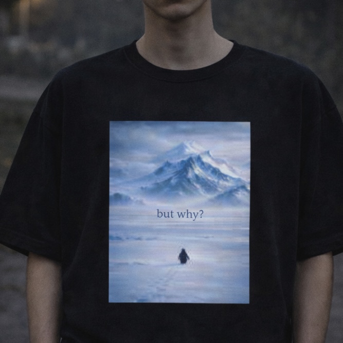 Кинематографичный арт-принт с холодным горным пейзажем и надписью BUT WHY? — для тех, кто мыслит глубже и не принимает всё по шаблону.